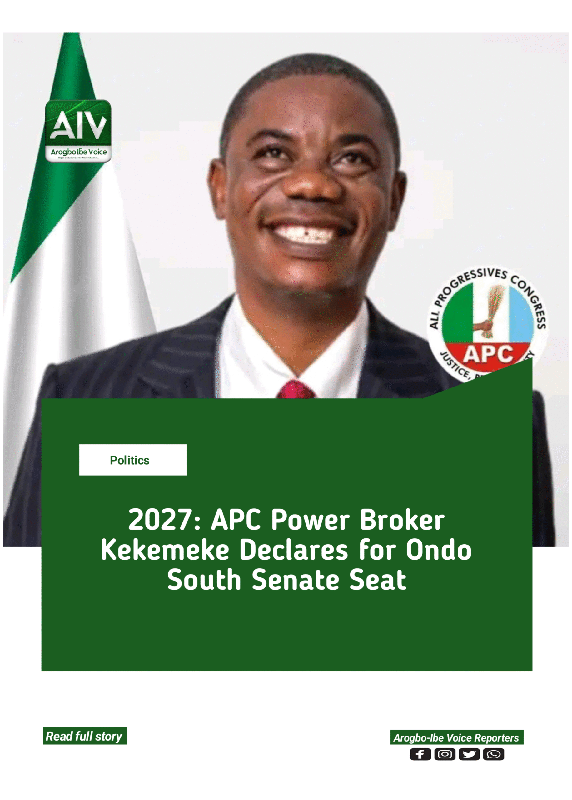 A top member of the All Progressives Congress, Isaacs Kekemeke, has announced his plan to contest the Ondo South Senatorial seat in the 2027 general elections