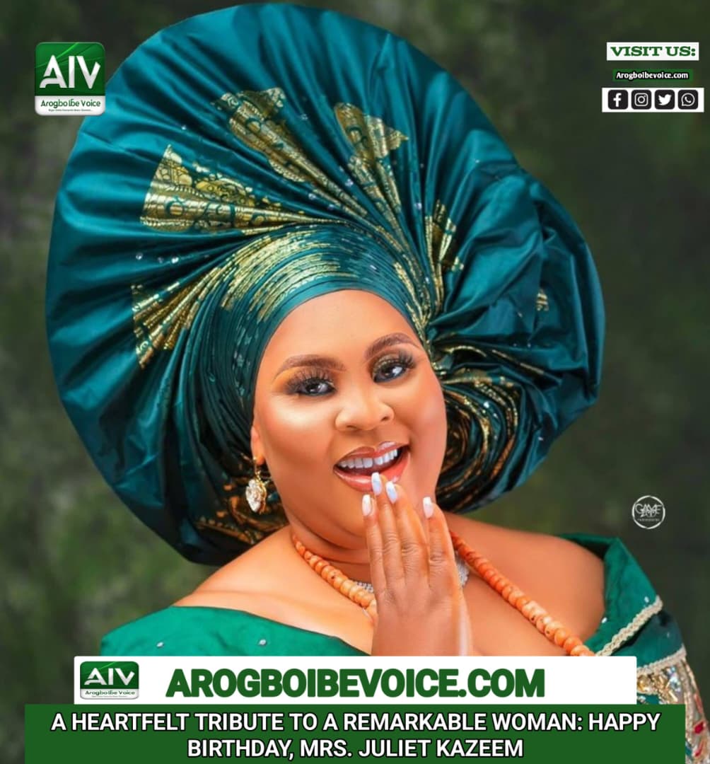 Today, the Management and Staff of Arogbo-Ibe Voice Reporters take great pleasure in shining the spotlight on the extraordinary Mrs. Juliet Kazeem; a trailblazing businesswoman, compassionate humanitarian, and proud daughter of the Niger Delta. Her unwavering dedication to uplifting lives and empowering communities is a reflection of her urbane values and unshakeable commitment to making a positive impact.