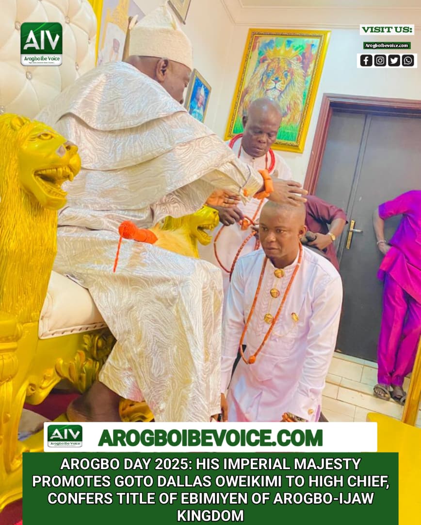 The promotion, which was conferred during the grand celebration of Arogbo Day Festival on the 30th of September 2025, further cements High Chief Oweikimi’s place as a pillar of strength, service, and pride within the Arogbo-Ijaw Kingdom, earning him admiration across the Niger Delta.