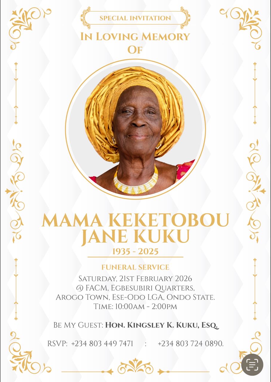 Arogbo Kingdom in Ese-Odo Local Government Area of Ondo State is today, Saturday, 21st February 2026, hosting Day Three of the funeral ceremonies of Mama Keketobou Jane Kuku (née Gbamila), a devoted Christian and matriarch whose life spanned 90 remarkable years.