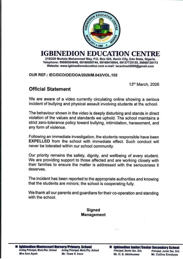 Igbinedion further said that beyond disciplinary action, the incident should serve as a reminder of the need to reinforce values such as empathy, kindness, and respect among students.