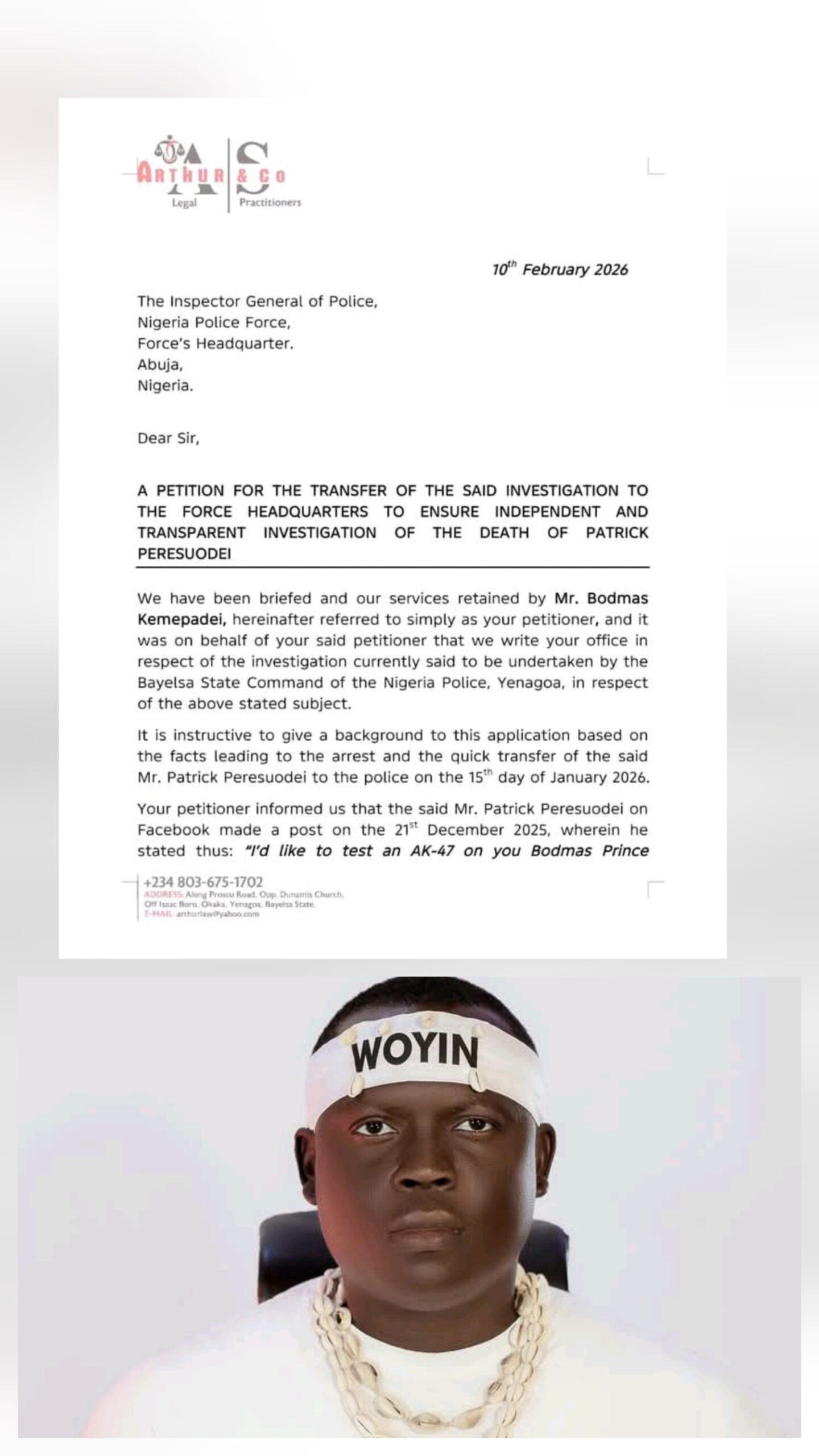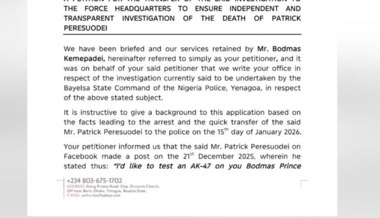 YENAGOA — Apostle Bodmas has engaged the services of a former Attorney General of Bayelsa State and formally petitioned the Inspector-General of Police (IGP) over the death of Mr. Patrick Peresuodei, calling for an independent and unbiased investigation into the circumstances surrounding the incident.