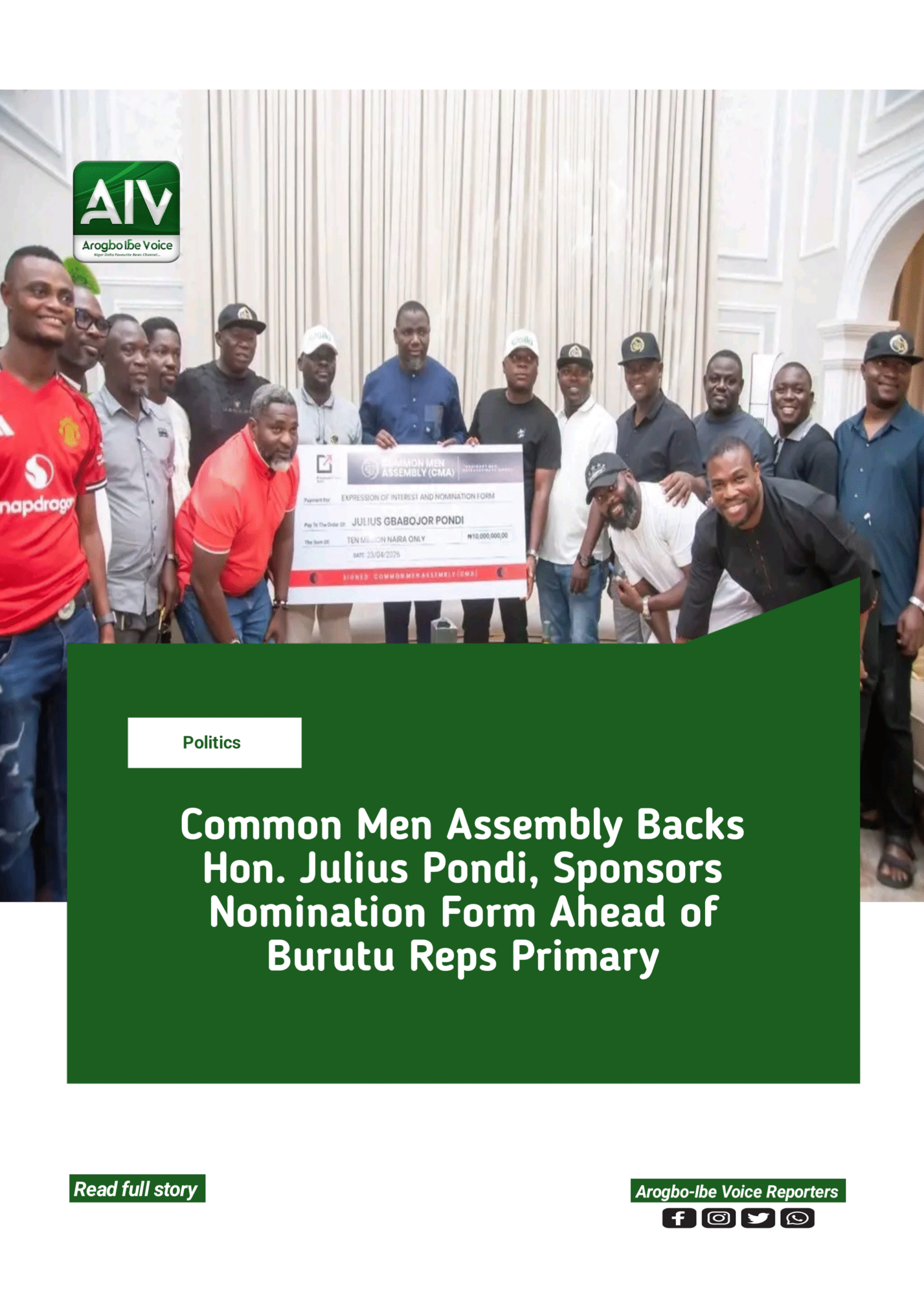 Common Men Assembly Backs Hon. Julius Pondi, Sponsors Nomination Form Ahead of Burutu Reps Primary