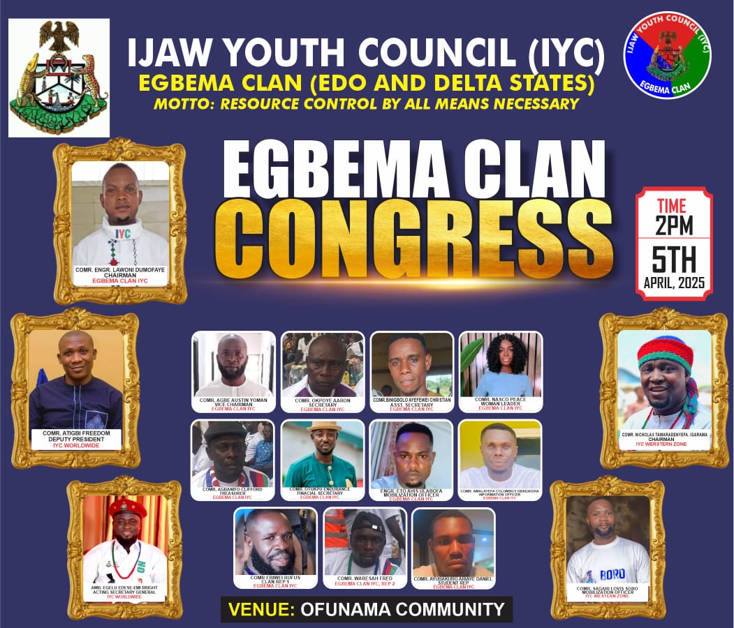 The Ijaw Youth Council (IYC), Egbema Clan, covering communities in Edo and Delta States, has scheduled its congress for Saturday, April 5, 2025, at Ofunama Community. The meeting, set for 2 PM, will bring together key stakeholders, traditional leaders, and youth representatives to deliberate on pressing issues affecting the Egbema people. Additionally, to mark one year in office of the current clan leadership, a get-together will be held at the end of the interactive session.