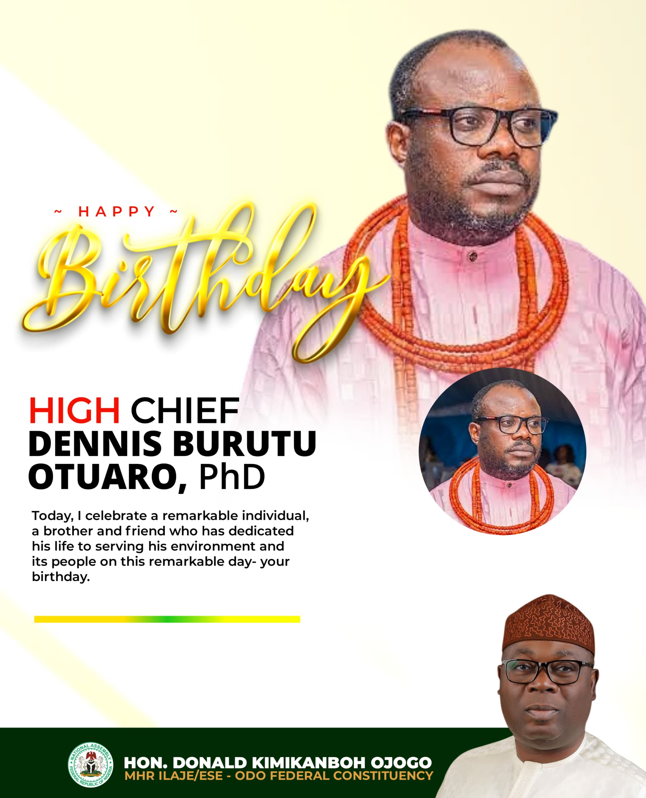 The Member representing Ilaje/Ese-Odo Federal Constituency in the House of Representatives, Hon. Donald Kimikanboh Ojogo, has extended warm felicitations to the Administrator of the Presidential Amnesty Programme (PAP), High Chief (Dr.) Dennis Burutu Otuaro, PhD, on the occasion of his birthday.