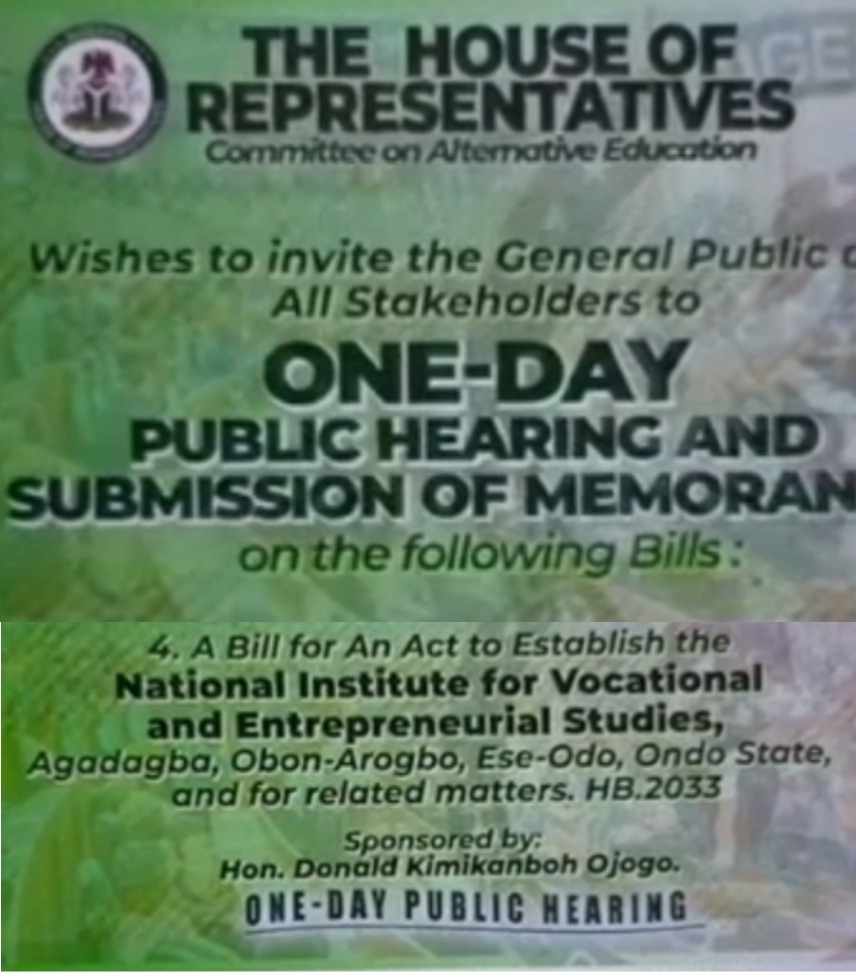 Abuja, the House of Representatives Committee on Alternative Education has announced a one-day public hearing and submission of memoranda on four bills seeking the establishment of new vocational and entrepreneurial institutions across the country.