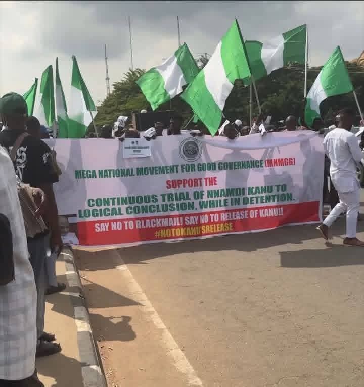 While Kanu’s sympathizers were tear-gassed, battered, dragged on the ground, and thrown into vans, the other group, led by one Chizorom Ofoegbu, marched comfortably with full security cover chanting anti-Kanu slogans and brandishing banners praising the government.