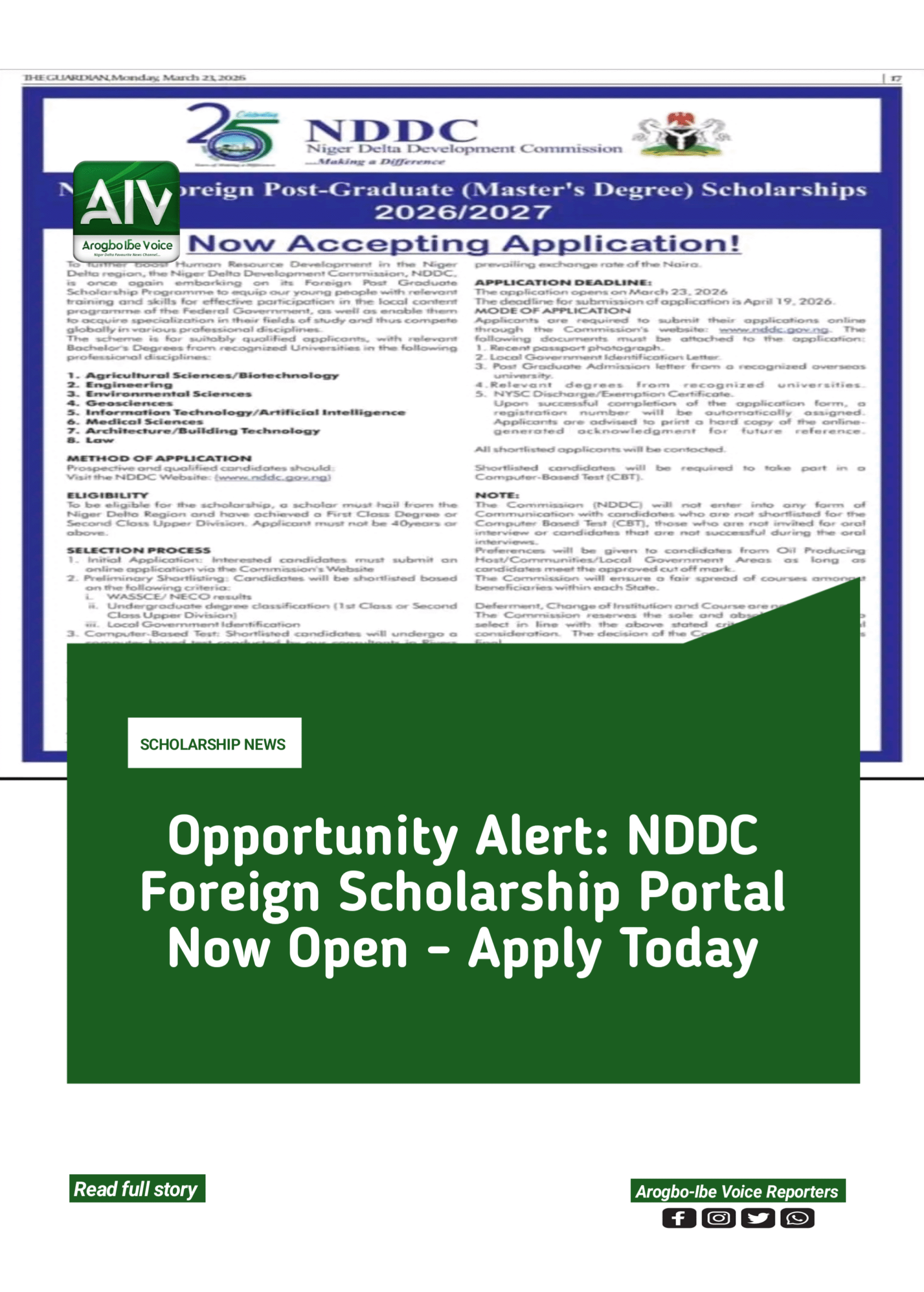 The Niger Delta Development Commission (NDDC) has announced the commencement of applications for its 2026/2027 Foreign Master’s Postgraduate Scholarship Programme.
