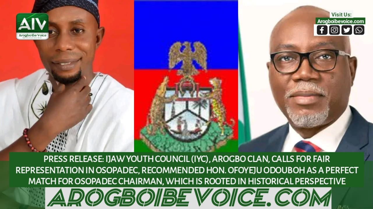 Press Release: Ijaw Youth Council (IYC), Arogbo Clan, calls for fair representation in OSOPADEC, recommended Hon. Ofoyeju Odouboh as a perfect match for OSOPADEC Chairman, which is rooted in historical perspective