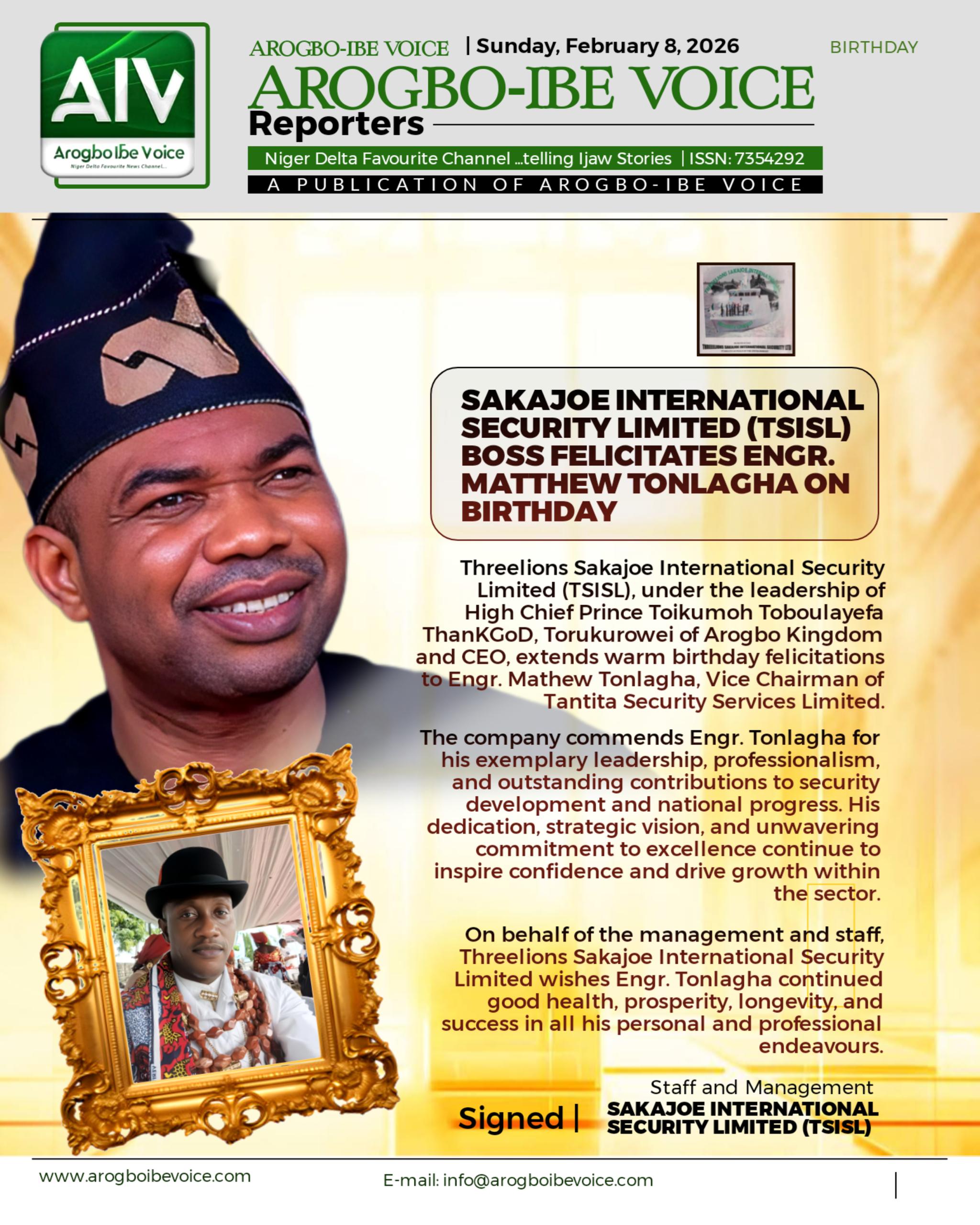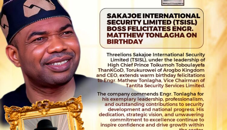 Threelions Sakajoe International Security Limited (TSISL), under the leadership of High Chief Prince Toikumoh Toboulayefa ThanKGoD, Torukurowei of Arogbo Kingdom and CEO, extends warm birthday felicitations to Engr. Mathew Tonlagha, Vice Chairman of Tantita Security Services Limited.