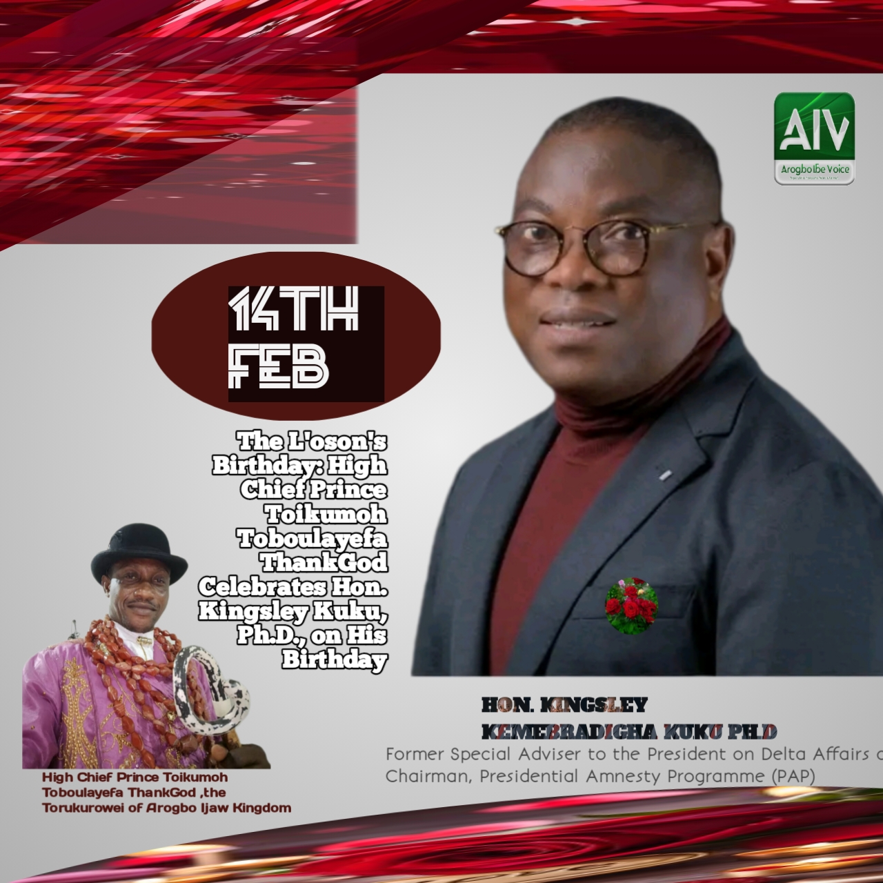 The Torukurowei of Arogbo-Ijaw Kingdom and Third Phase General, High Chief Prince Toikumoh Toboulayefa ThankGod, has extended his warm birthday wishes to Chief (Hon.) Kingsley Kemebradigha Kuku, Ph.D., former Special Adviser to the President on Niger Delta Affairs and Chairman of the Presidential Amnesty Programme (PAP).