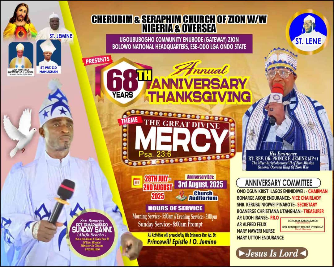 The Cherubim & Seraphim Church of Zion, Ugoububogho, is set to host what promises to be one of the most spiritually charged gatherings of the year, its 68th Annual Thanksgiving Anniversary.